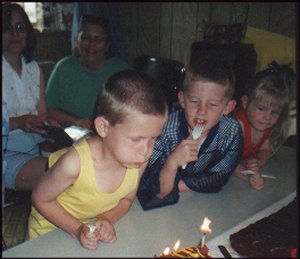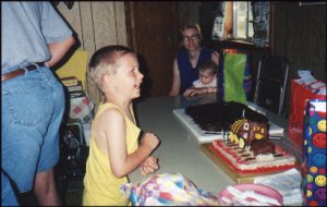 Alexander - April 19, 1998 - 5 years old![]() Alexander blows out the candles. Ummmm. A Chocolate Cake locomotive "Let's see. Gifts or cake first?" Randy and Sandra look on. |